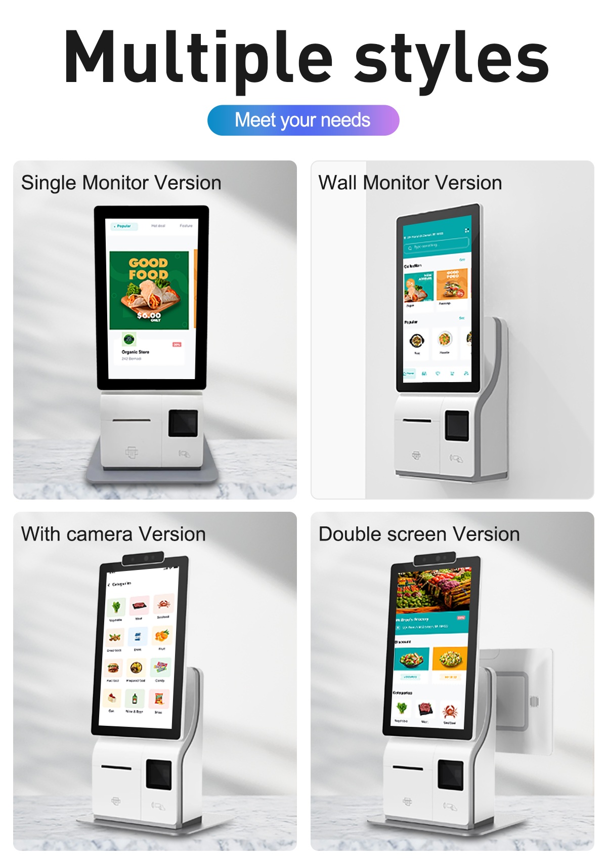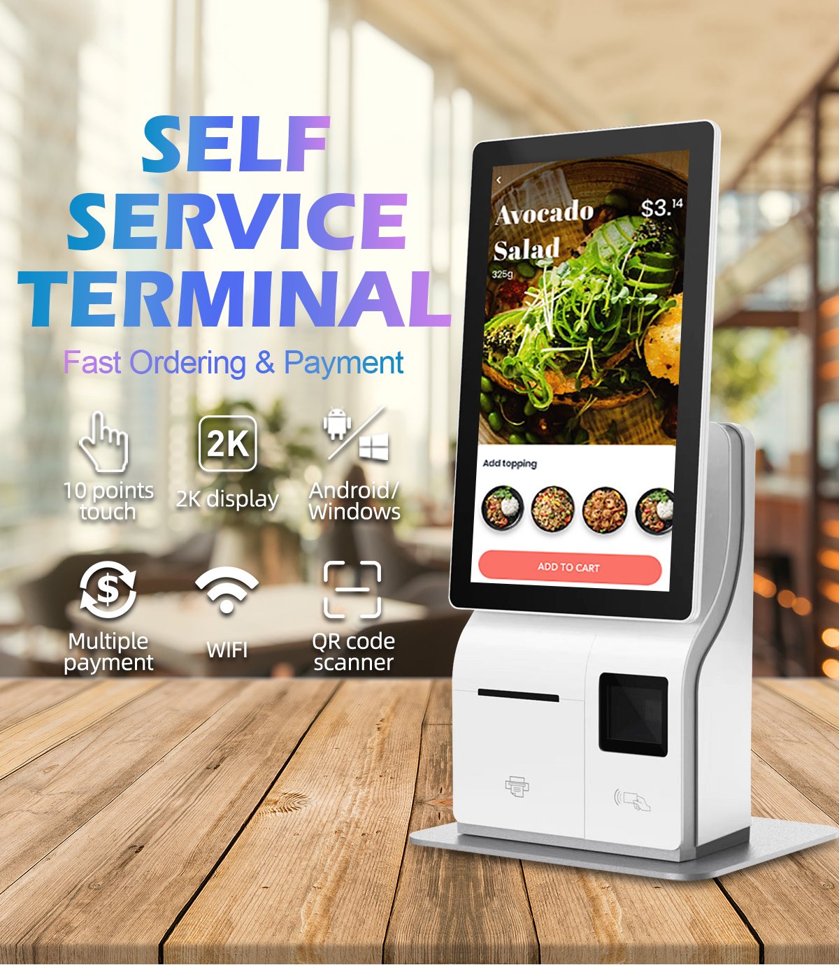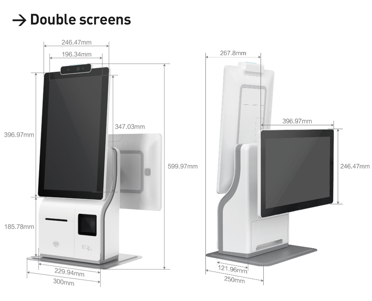 The self-service ordering kiosk has become the standard configuration of many restaurants. Many customers welcome the self-service ordering and scanning code ordering, because self-service ordering can reduce the dependence on the shop assistant. Even when the shop assistant is busy preparing, passing dishes, packing and other work, customers can directly complete the ordering without waiting, which is convenient, fast and time saving. However, some restaurants need smaller mini payment kiosk because of their small storefronts. The SOSU is only half the size of the cash registers on the market, and a girl can lift self checkout kiosk easily with her hands. The mini self-service kiosk supports such functions as face brushing payment, code scanning payment and thermal printing of small bills, and can be used as a self-service order cash register.15.6 inch self ordering kiosk for restaurants large dual screen with high-definition dual side screen, 1080p high-definition. The 15.6 inch resolution sub screen can display the broadcast advertising map, purchase advertising cash register and sales promotion